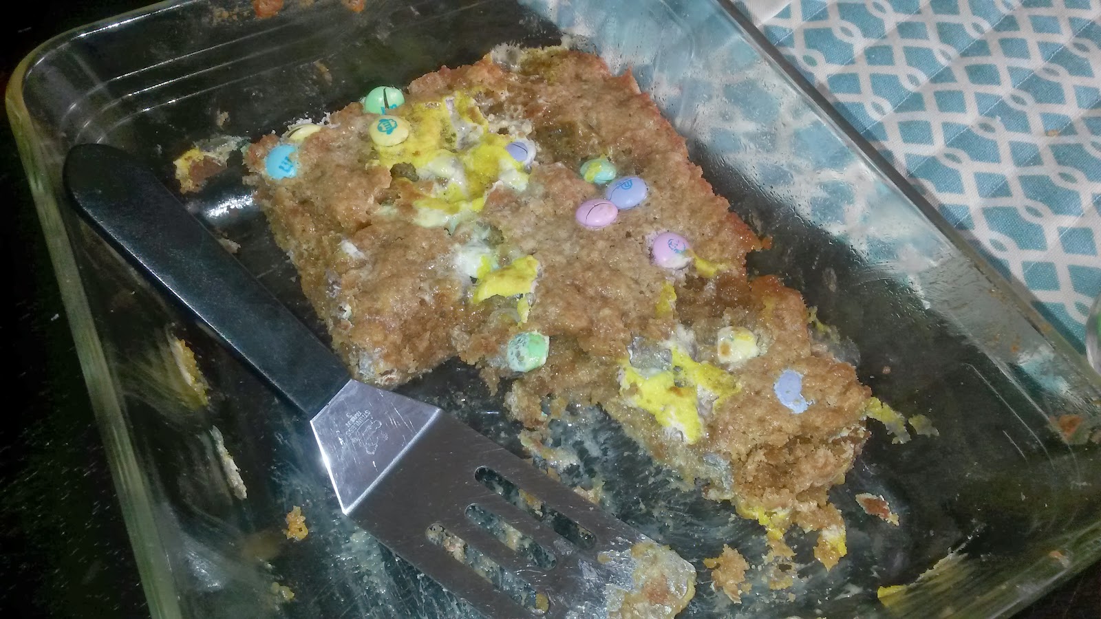 Here are the directions on the tag: Remove bag of ingredients from jar. In a bowl combine with the dry ingredients ½ cup butter, 1 egg, 1 teaspoon vanilla. In an 8x8 pan spread batter onto bottom of the pan. Sprinkle the M&Ms over the mixture. Snip the bunnies into bits with kitchen shears and sprinkle over the mixture. Bake in 350 degree oven for 20 to 25 minutes until they are golden brown. Cool completely and cut into bars. Enjoy!